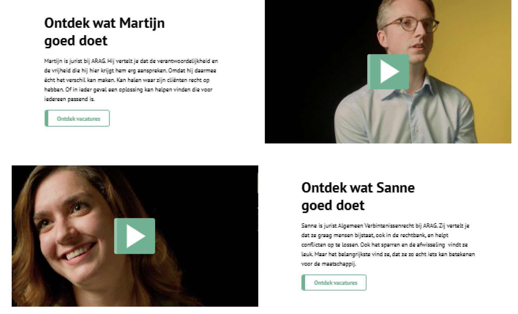 Hieronder vind je alvast een aantal video’s van verschillende ARAG medewerkers. Die het recht graag toegankelijk maken voor iedereen. En je persoonlijk vertellen hoe zij dat bij ARAG doen. Zelfstandig én samen met hun collega’s. Dus misschien binnenkort ook met jou!